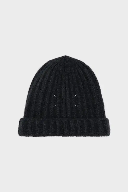 The beanie hat features a ribbed finish with a turn-up design. It is soft-touch, crafted from luxurious felted lambswool, and inspired by British school uniforms. Maison Margiela's signature, the four stitches, appear at the back; the opposite of a label.