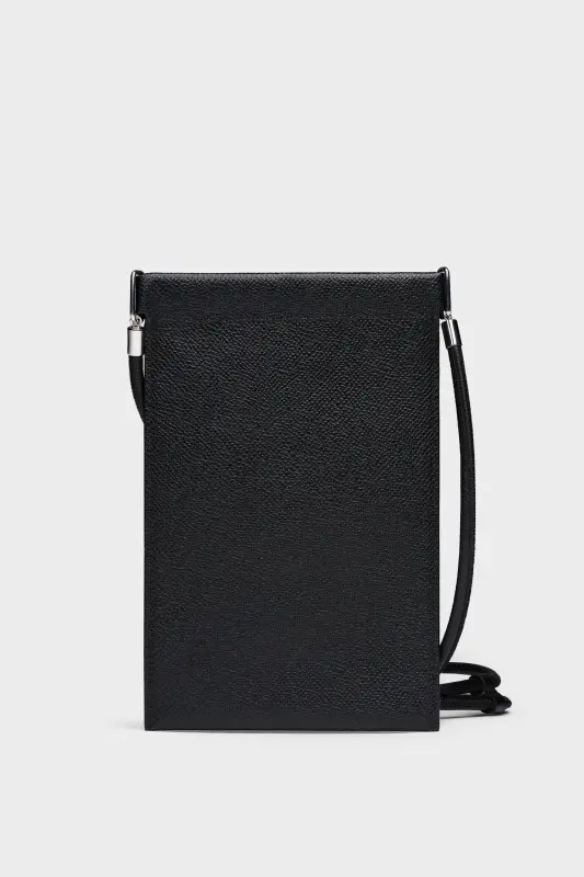 This phone holder has a secure snap button flap closure and is crafted from grainy leather, with an adjustable tonal strap that can be worn around the neck. Maison Margiela's signature, the four stitches, appear on the front; the opposite of a label.