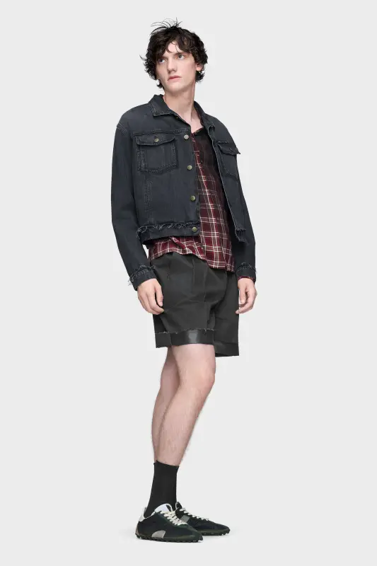 Crafted from washed denim, this caban jacket reveals signs of lived wear: fading, softened lines and gentle fraying at the hem. The silhouette maintains the structure of naval tailoring, reinterpreted through a fabric rooted in workwear. A study in contrasts, it elevates the familiar through subtle distortion. At the back, the Maison’s signature four stitches appear; the opposite of a label.