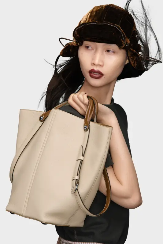 The Maison launches the Dress-age handbag for SS25, crafted from soft pebbled calfskin. With an equestrian spin, the medium handbag features classic leatherwork and refined lines, combining unconscious glamour with gestural design. It follows a trapezoid shape with contrast dual-wear strap detail. The studded base allows the bag to stand, and the inner is adorned with the logo. Maison Margiela's signature, the four stitches, appear at the back; the opposite of a label.