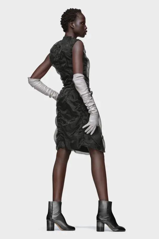An airy silhouette shaped by unconscious gesture. This sleeveless organza dress is ruched and gathered at the waist, exaggerating its sculptural form with natural asymmetry. Voluminous yet refined, the design evokes the Maison’s Gestural Cutting technique through expressive, rippling texture. At the back, the Maison’s signature four stitches appear; the opposite of a label.