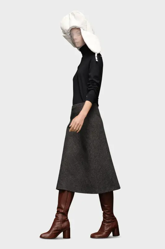An A-line skirt in herringbone wool lending a minimal aesthetic. At the back, four white stitches show the hand of the Maison: the opposite of a label.