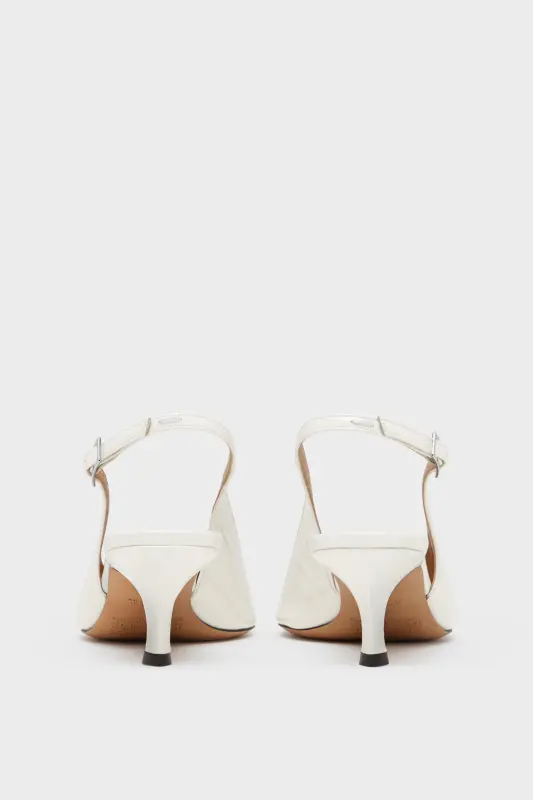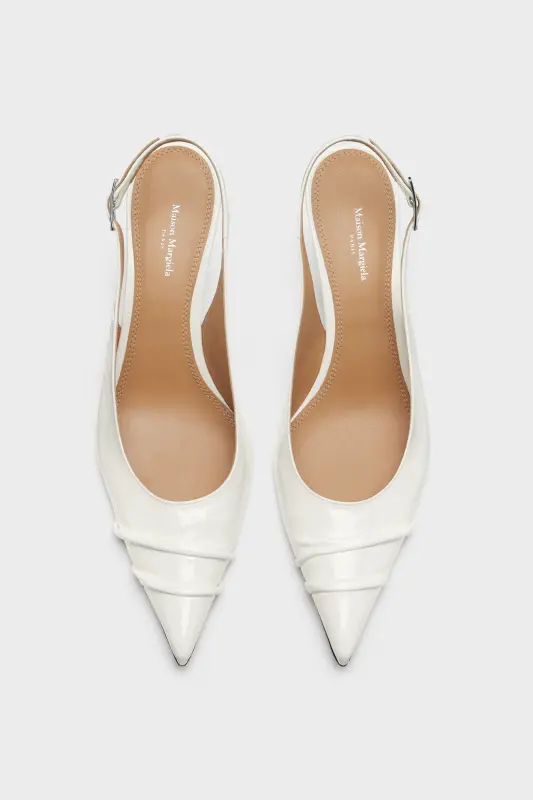 Maison’s Kinkies slingbacks offer a new ladylike shoe silhouette. Crafted from soft patent leather, the shoes feature handmade pleats referencing the 'memory-of' gesture, alluding to a pre-loved movement. They are reinforced with rubber at the toe for longevity, and are finished on a 5.5 cm heel. Maison Margiela's signature stitch appears at the back.
