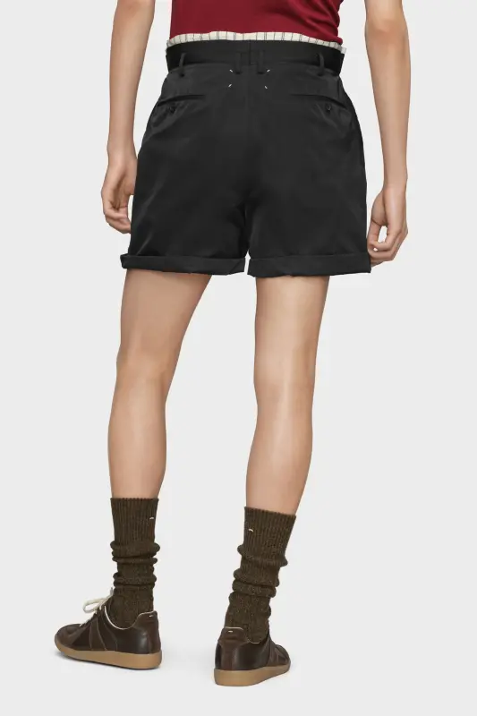 Tailored with clean pleats and raw hems, these shorts offer subtle versatility. A striped lining is partially exposed at the waistband – an intentional reveal that reflects the Maison’s play with Anonymity of the Lining. Maison Margiela’s signature, the four stitches, appear at the back; the opposite of a label.