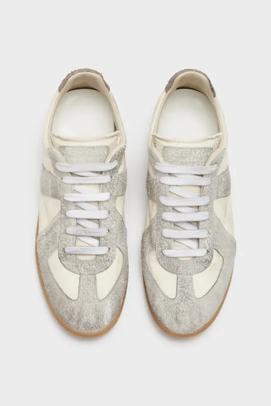 The Replica sneakers in dirty treatment nylon and hairy suede are supported by a classic rubber sole. The Maison's iconic Replica model is inspired by Austrian sports shoes from the seventies. Details on the Replica pairs are continually reworked in line with the season's inspirations. Maison Margiela's signature white stitch appears at the back.