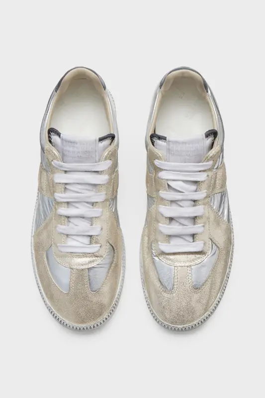The Replica Iridescent sneakers are crafted in smooth calfskin and a glitter suede with a high-shine finish and iridescent coating that reflects coloured tones in the light. The Maison's iconic Replica sneakers are inspired by Austrian sports shoes from the seventies. Details on the Replica pairs are continually reworked in line with the season's inspirations.