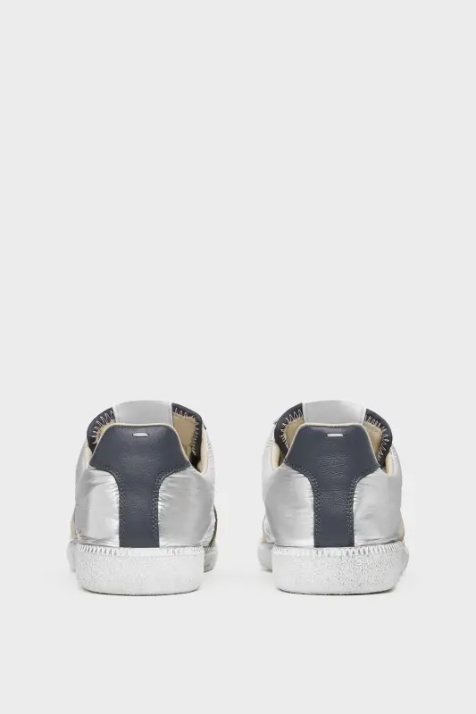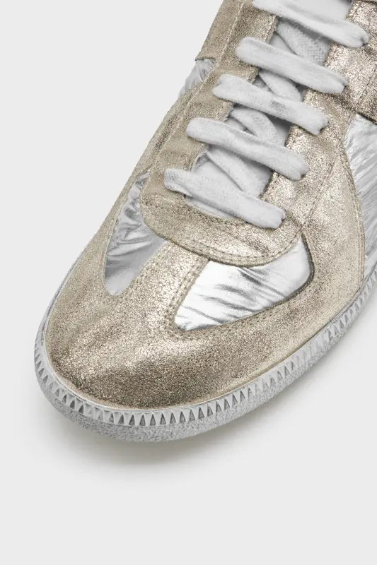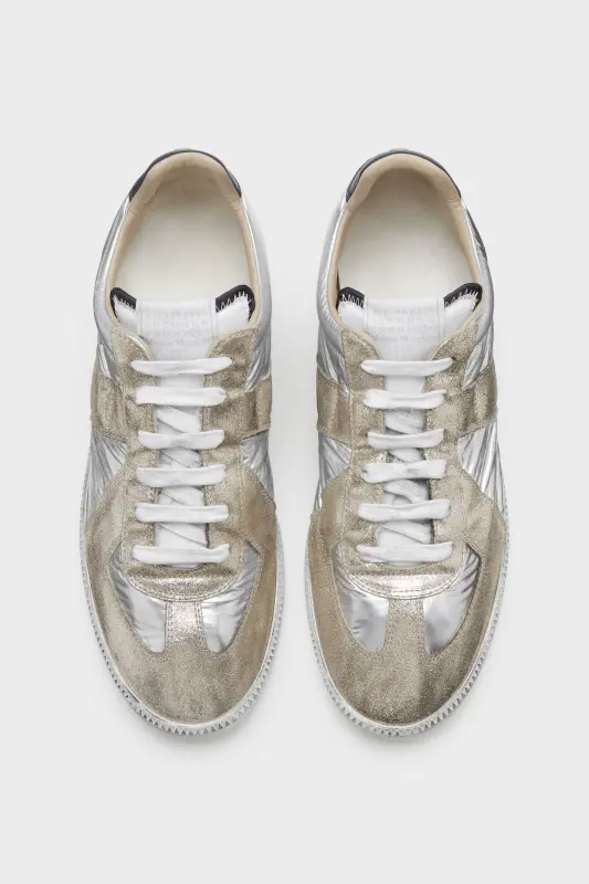 The Replica Iridescent sneakers are crafted in smooth calfskin and a glitter suede with a high-shine finish and iridescent coating that reflects coloured tones in the light. The Maison's iconic Replica sneakers are inspired by Austrian sports shoes from the seventies. Details on the Replica pairs are continually reworked in line with the season's inspirations.