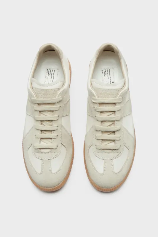 The Replica sneakers in nappa leather and suede with a honey sole. The Maison's iconic Replica sneakers are inspired by Austrian sports shoes from the seventies. Details on the Replica pairs are continually reworked in line with the season's inspirations.