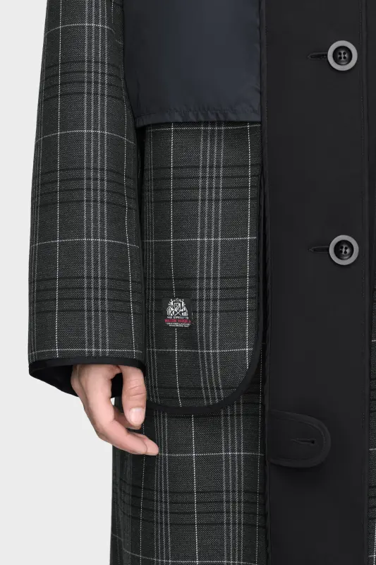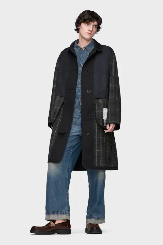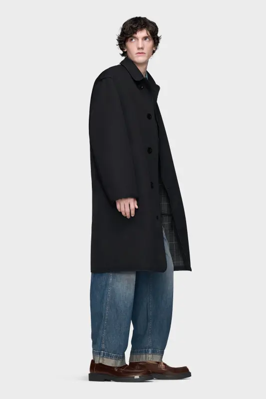 This reversible coat in a bonded construction shifts between classic and contemporary: a traditional checked wool on one side, contrasted with a smooth technical surface on the other. The reversible style features oversized pockets and a relaxed silhouette. A garment of dual character, it captures the Maison’s innovative codes. At the back, the Maison’s signature four stitches appear; the opposite of a label.