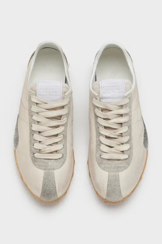 Mit einer Vintage-Behandlung und einer übertriebenen Haptik legen die Sprinter das Design der Stollenschuhe aus den 1960er-Jahren neu auf. Dieses Modell wird aus Rau- und Kalbsleder gefertigt, mit einer genoppten Sohle versehen und präsentiert sich mit einem Zahlendesign, das mit der eingekreisten Zahl 22 auf die Schuhkollektion des Hauses verweist. Seine Zunge wird vom Numeric Logo und seine Rückseite vom für Maison Margiela charakteristischen Heftstich geziert.