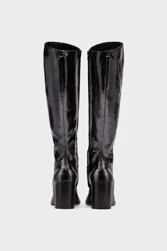 With a broken mirror finish, these heeled knee-high boots feature the Tabi split-toe, inspired by the traditional 15th century Japanese sock bearing the same name – launched for the Maison's debut collection in 1989. It captures the avant-garde and insubordinate spirit of the Maison and exists as a heritage classic, continually explored through each collection.