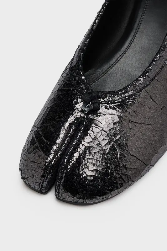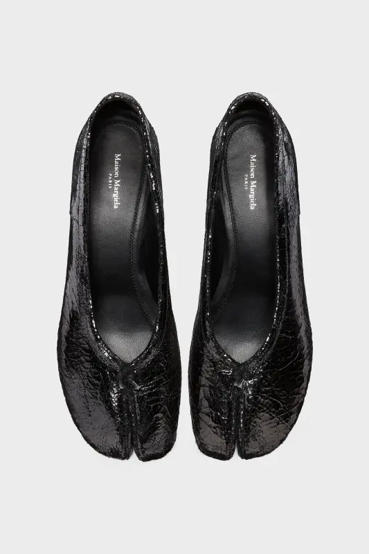 Maison Margiela presents the Tabi new ballerinas, which take their design from ballerina shoes in the house archives. In a broken mirror finish leather, with small heel, the pair feature the Tabi split-toe, inspired by the traditional 15th century Japanese sock bearing the same name – launched for the Maison's debut collection in 1989. It captures the avant-garde and insubordinate spirit of the Maison and exists as a heritage classic, continually explored through each collection.