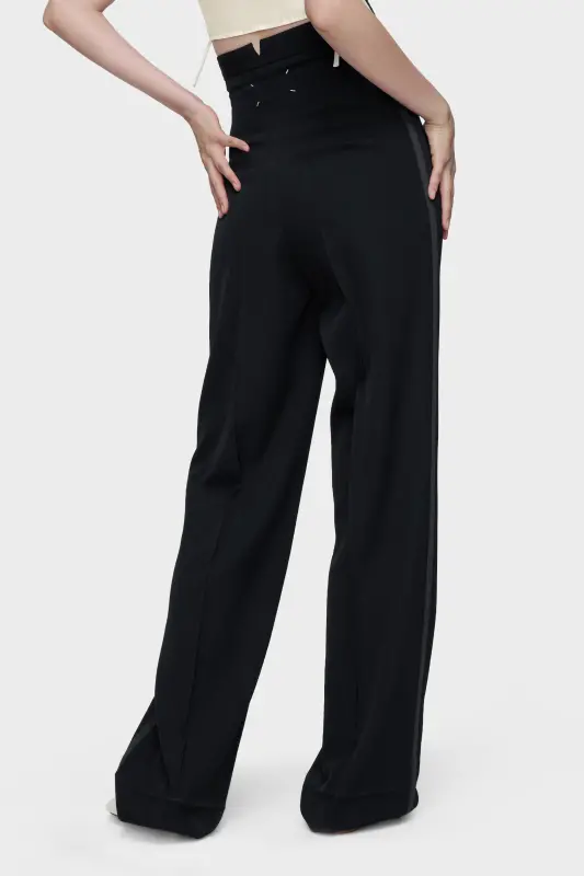 These virgin wool trousers are cut with a high waist and elongated straight leg, their line sharpened by front pleats. Satin stripes run the side seam, evoking tuxedo references while underscoring a refined silhouette. At the back, the Maison’s signature four stitches appear; the opposite of a label.