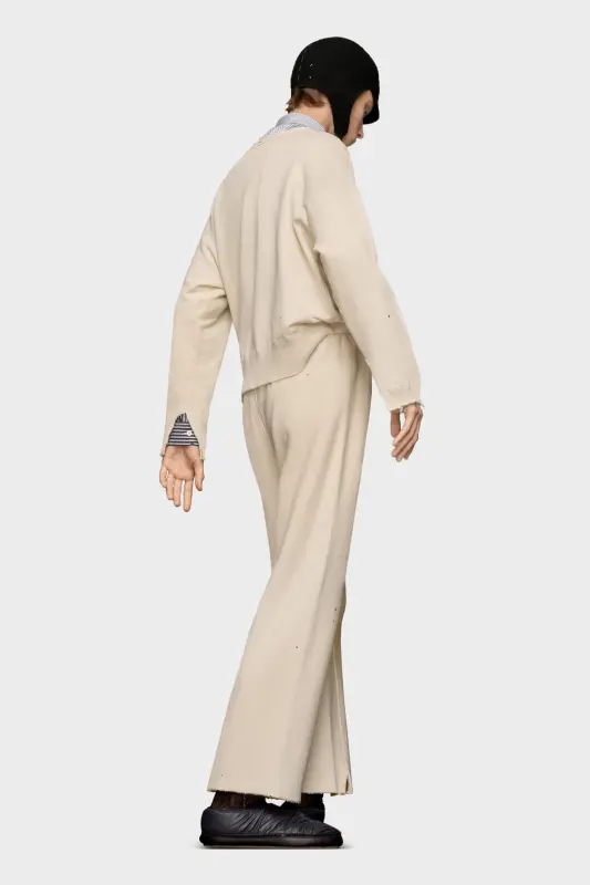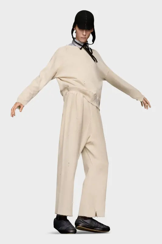 The sweatpants feature a stretch waist and cut, raw-edge hems for an undone aesthetic. Maison Margiela’s signature, the Four stitches, appear at the back; the opposite of a label.