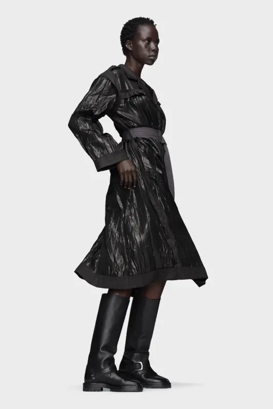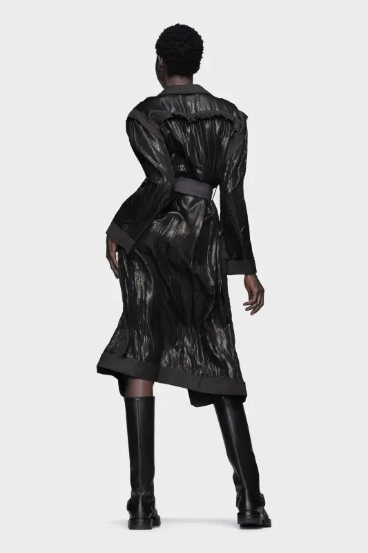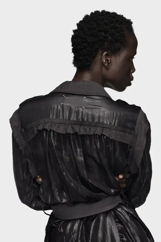 A reimagining of the trench coat in crinkled lamé, this piece offers a tactile interplay of matte and shine. Décortiqué shoulder details highlight hidden structures, while tonal trims and a structured belt frame the silhouette. The inside-out suggestion reveals a new form – a coat that becomes a dress. Maison Margiela’s signature, the four stitches, appear at the back; the opposite of a label.