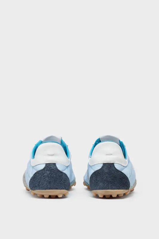 The Sprinters revisit 1960s spike shoes with a vintage-treated finish and exaggerated tactility. Crafted in hairy suede and calfskin, the design recalls town and countryside staples with quilted panels and a bold heel tab. The cleated sole includes numeric detailing, with 22 circled to indicate the Maison’s footwear collection. The tongue bears the numeric logo, while Maison Margiela’s signature single white stitch appears at the back.