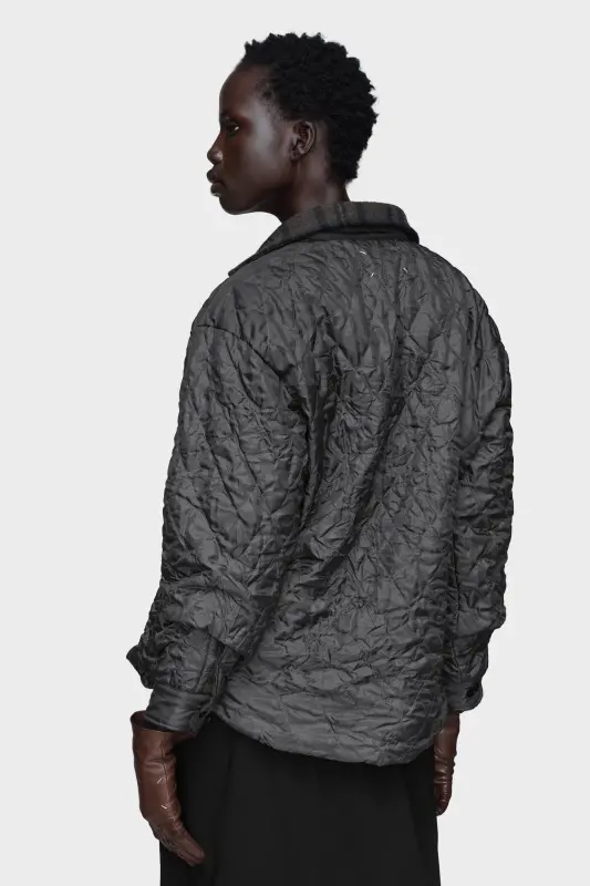 This reversible padded shirt-jacket is constructed with quilted panels that ripple across the surface. The checked wool collar evokes rural archetypes, while the padded volume offers both warmth and shape. Maison Margiela’s signature, the four stitches, appear at the back; the opposite of a label.