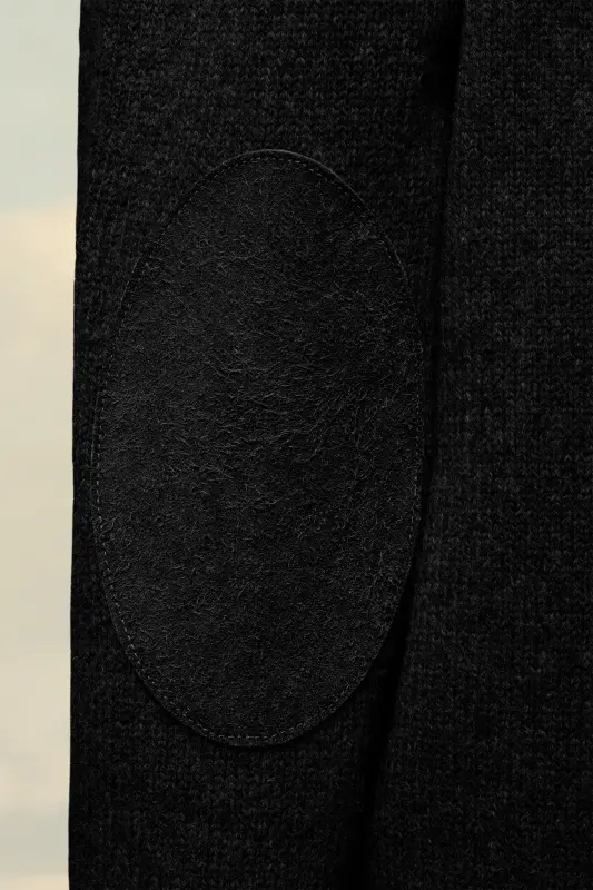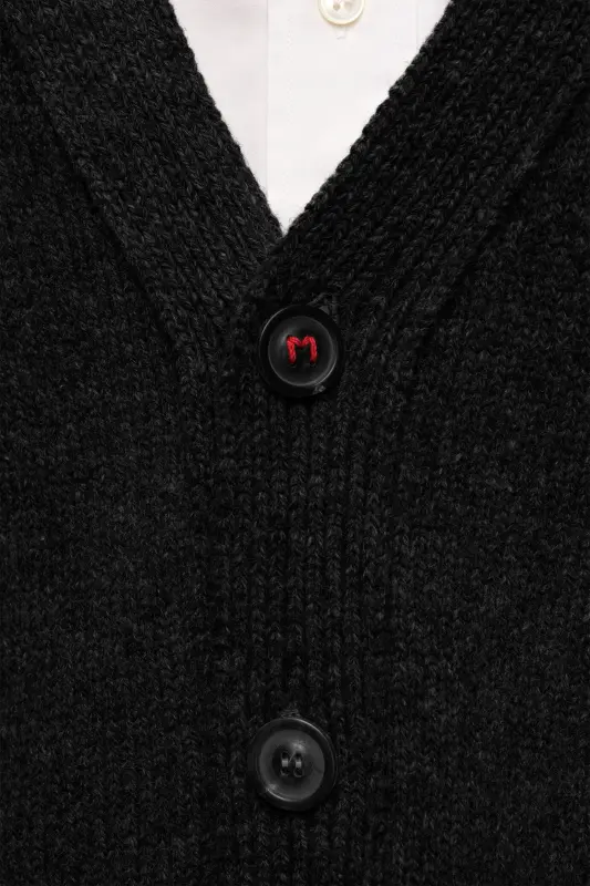 This low V-neck knit cardigan with long sleeves and ribbed trims features tonal elbow patches. At the back, four white stitches show the hand of the Maison: the opposite of a label. Gauge 5.