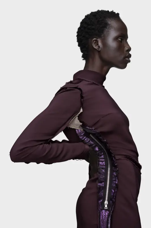 Cut in a sculpted silhouette, this long-sleeved dress reveals glimmers of a metallic lamé along the side seams. Soft ruching through the body enhances the shape, while the contrast textures add subtle dimension. Maison Margiela’s signature, the four stitches, appear at the back; the opposite of a label.