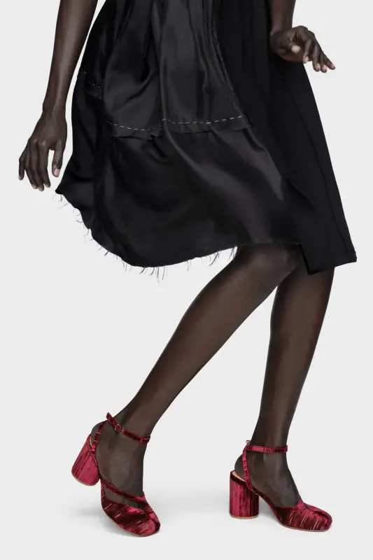 These block heel sandals are made from tactile velvet with a pleated, laser-worn finish. Each pair is stonewashed for subtle variation. The split toe and ovine leather lining complete a timeless evening-wear silhouette. They feature the Tabi split-toe, inspired by the traditional 15th century Japanese sock bearing the same name – launched for the Maison's debut collection in 1989. It captures the avant-garde and insubordinate spirit of the Maison and exists as a heritage classic, continually explored through each collection. Maison Margiela's signature single white stitch appears at the back.