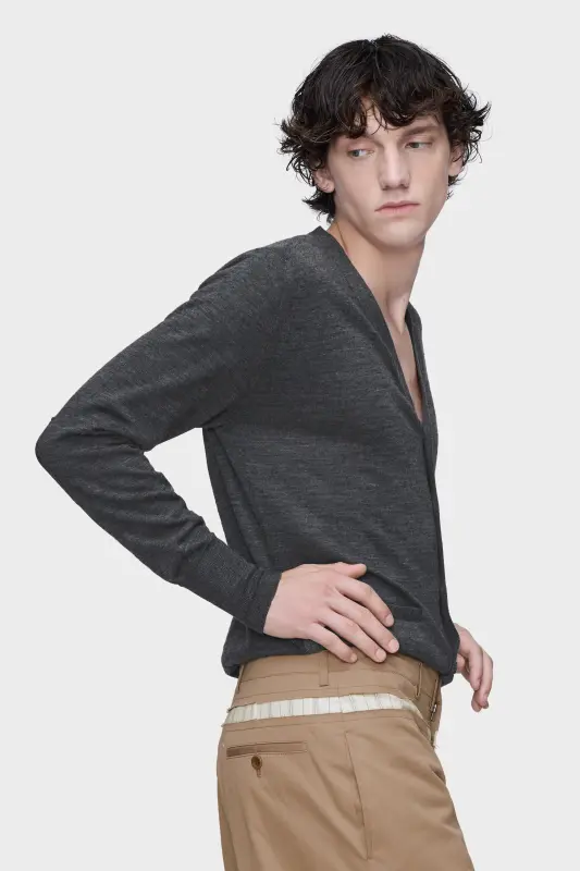 This cardigan is knitted in a fine wool blend, cut with a deep V-neckline and framed by ribbed cuffs and hem. Front buttons and discreet welt pockets underline its minimalist construction. At the back, the Maison’s signature four stitches appear; the opposite of a label.