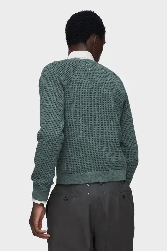 A V-neck sweater crafted from a wool blend, distinguished by an intricate jacquard pattern. Ribbed cuffs and hem provide structure, grounding the knit in classic detailing while the texture subverts its simplicity. At the back, the Maison’s signature four stitches appear; the opposite of a label.