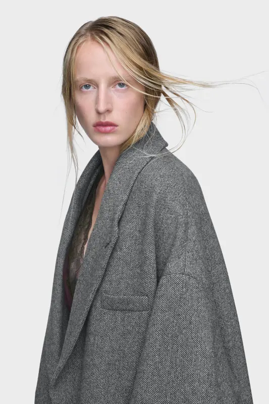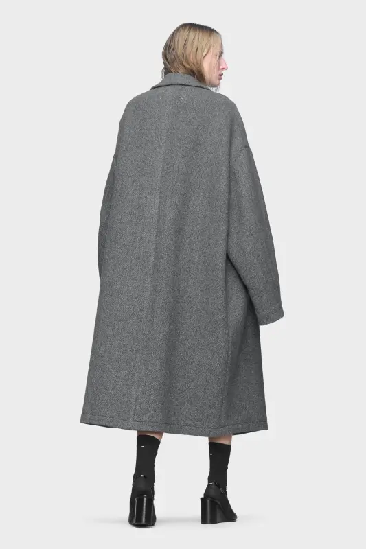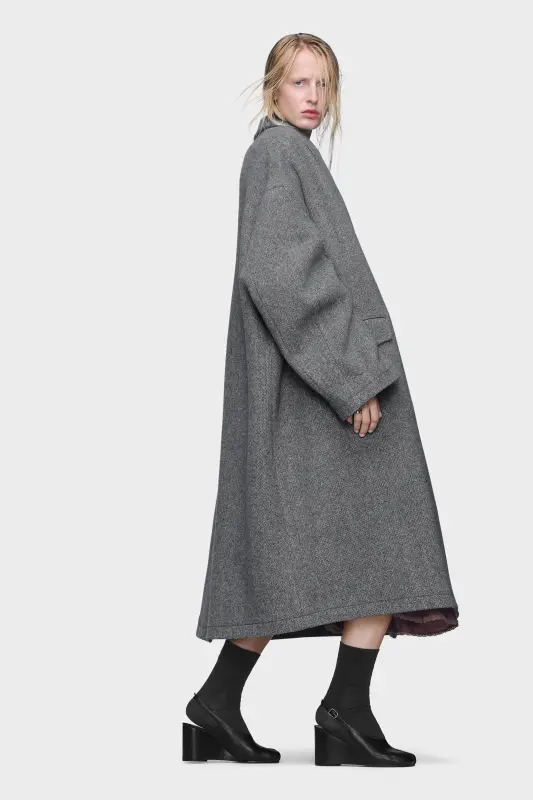 The wool coat is tailored with an enveloping silhouette, balancing the sharpness of traditional outerwear with a softened, oversized fall. It has a clean front, structured lapels, and lengthened proportions. At the back, the Maison’s signature four stitches appear; the opposite of a label.