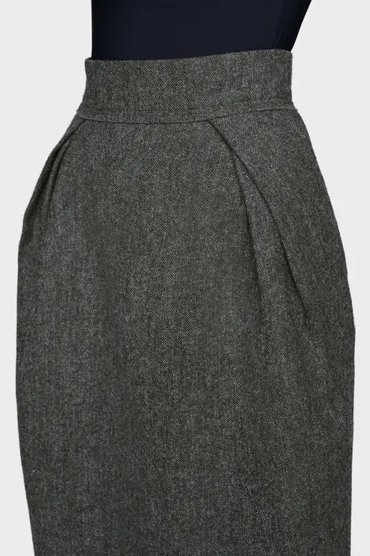 Tailored from thick wool with a soft herringbone texture, this midi skirt features structured front pleats that create volume through the hip. A high waistband frames the silhouette, drawing focus to the subtle architectural shaping. At the back, the Maison’s signature four stitches appear; the opposite of a label.