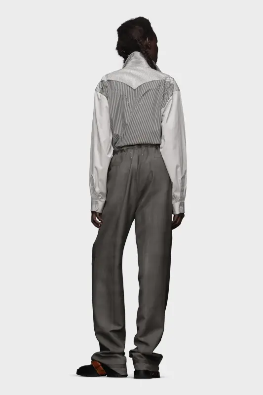 Made in wool mohair, the trousers showcase the Maison's Work-in-progress stitches around the waist. The casual drawstring is contrasted with smart pleats. They feature a hand-applied greasy patina technique for a lived-in look. Maison Margiela's signature, the Four stitches, appear at the back; the opposite of a label.